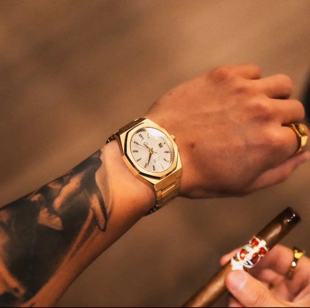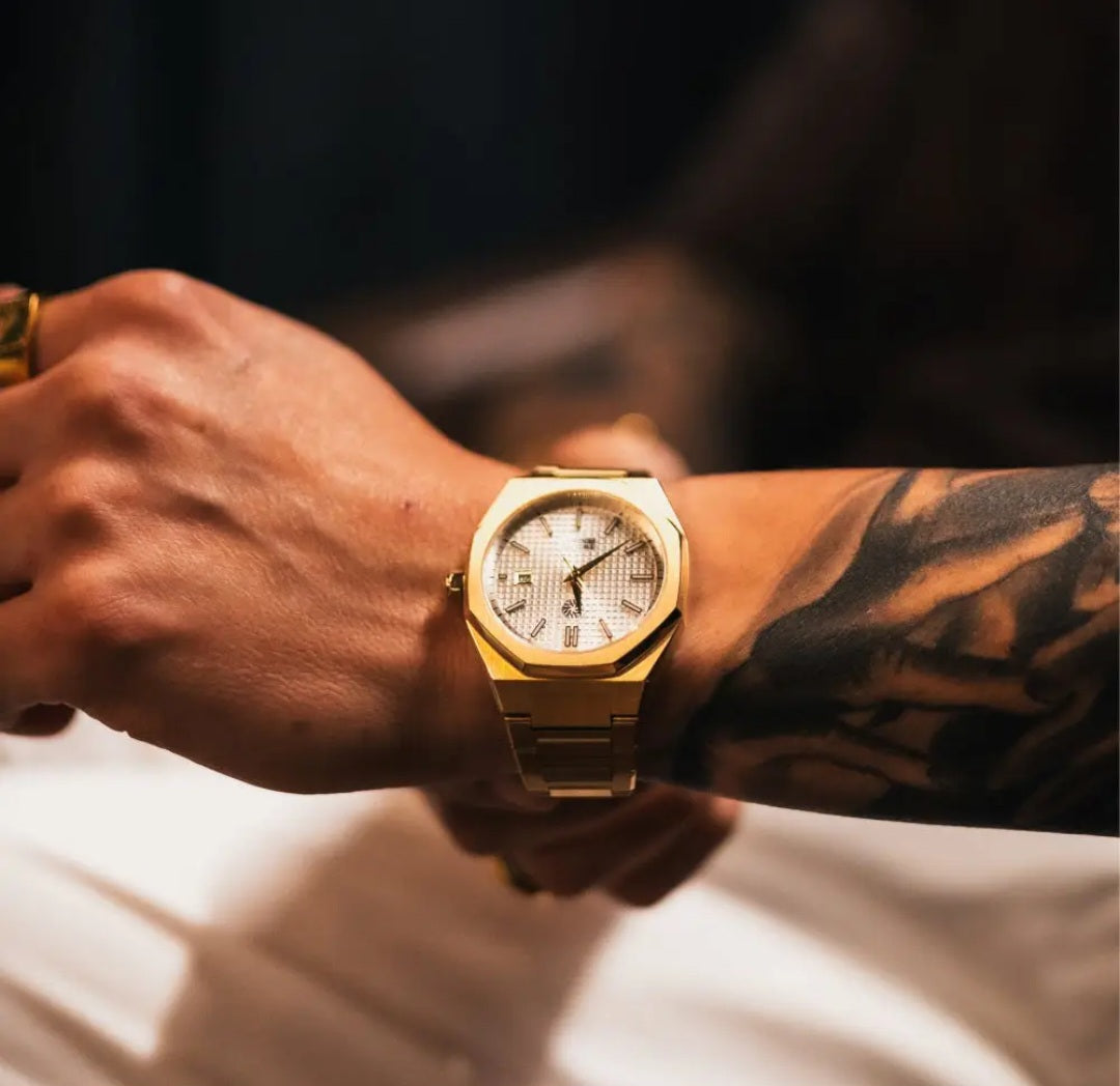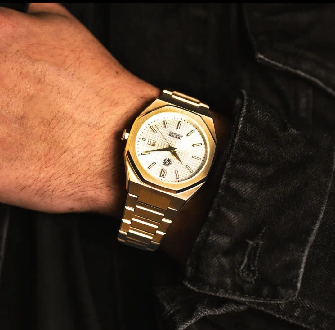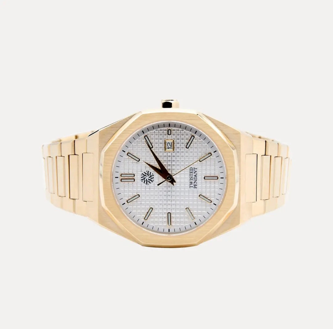 Featuring a geometric case shape and a white textured dial with gold indices, this watch embodies confidence and sophistication.