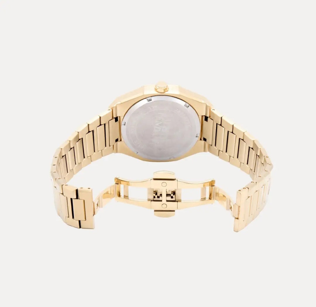 The refined design, polished gold-tone steel, and textured white dial create a bold yet sophisticated statement piece for any occasion. Key Features